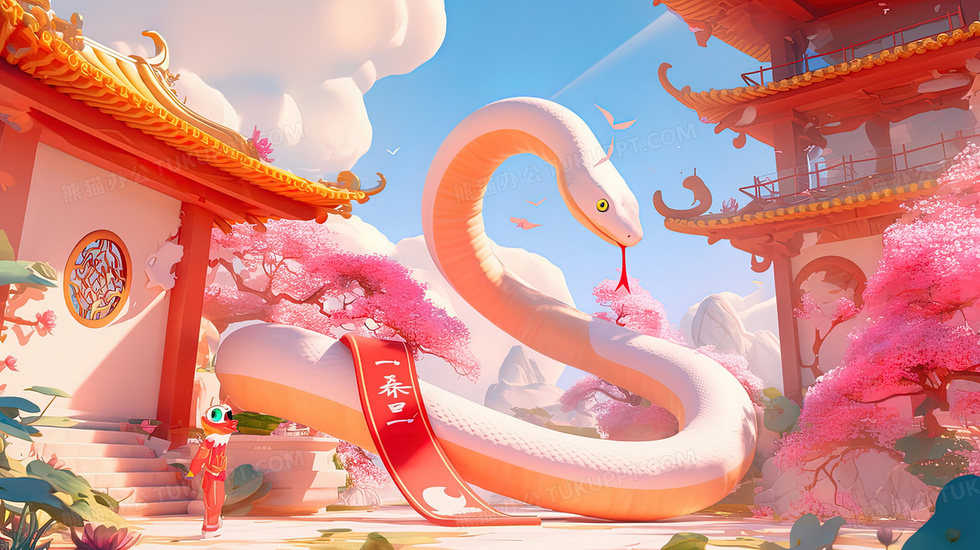 本作品内容为磅礴大气中式庭院建筑白蛇和春联插画, 格式为 jpg, 大小3 MB, 图片尺寸为2912 x 1632, 源文件无水印, 欢迎使用熊猫办公。 如认为平台内容涉嫌侵权,可通过邮件:tousu@tukuppt.com提出书面通知,我们将及时处理。