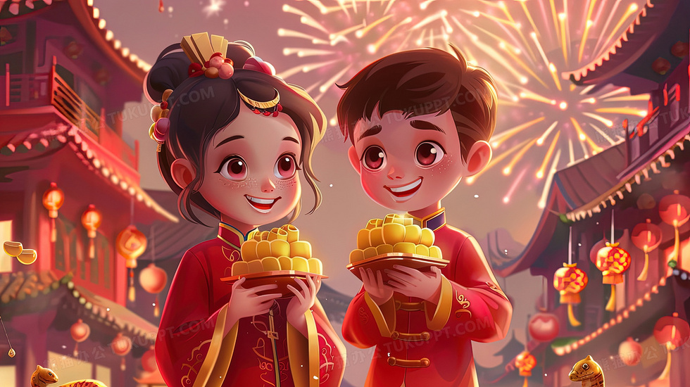 本作品内容为春节抱金币的卡通男孩女孩烟花插画, 格式为 jpg, 大小3 MB, 图片尺寸为2912 x 1632, 源文件无水印, 欢迎使用熊猫办公。 如认为平台内容涉嫌侵权,可通过邮件:tousu@tukuppt.com提出书面通知,我们将及时处理。