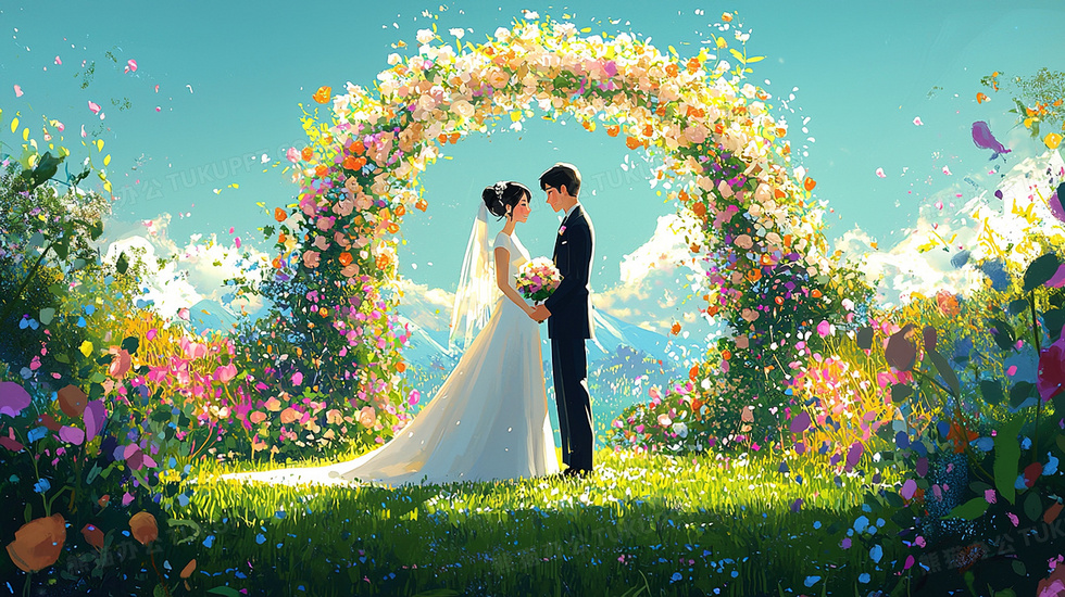 本作品内容为户外弧形花墙前的一对新婚夫妻插画, 格式为 jpg, 大小4 MB, 图片尺寸为2912 x 1632, 源文件无水印, 欢迎使用熊猫办公。 如认为平台内容涉嫌侵权,可通过邮件:tousu@tukuppt.com提出书面通知,我们将及时处理。