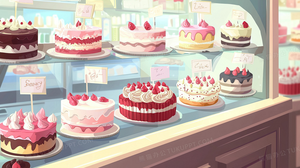 本作品内容为橱窗展示各式各样的蛋糕插画, 格式为 jpg, 大小3 MB, 图片尺寸为2912 x 1632, 源文件无水印, 欢迎使用熊猫办公。 如认为平台内容涉嫌侵权,可通过邮件:tousu@tukuppt.com提出书面通知,我们将及时处理。