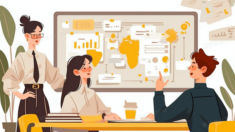 本作品内容为两个工作的白领在会议室讨论问题黄色调插画, 格式为 jpg, 大小3 MB, 图片尺寸为2912 x 1632, 源文件无水印, 欢迎使用熊猫办公。 如认为平台内容涉嫌侵权,可通过邮件:tousu@tukuppt.com提出书面通知,我们将及时处理。