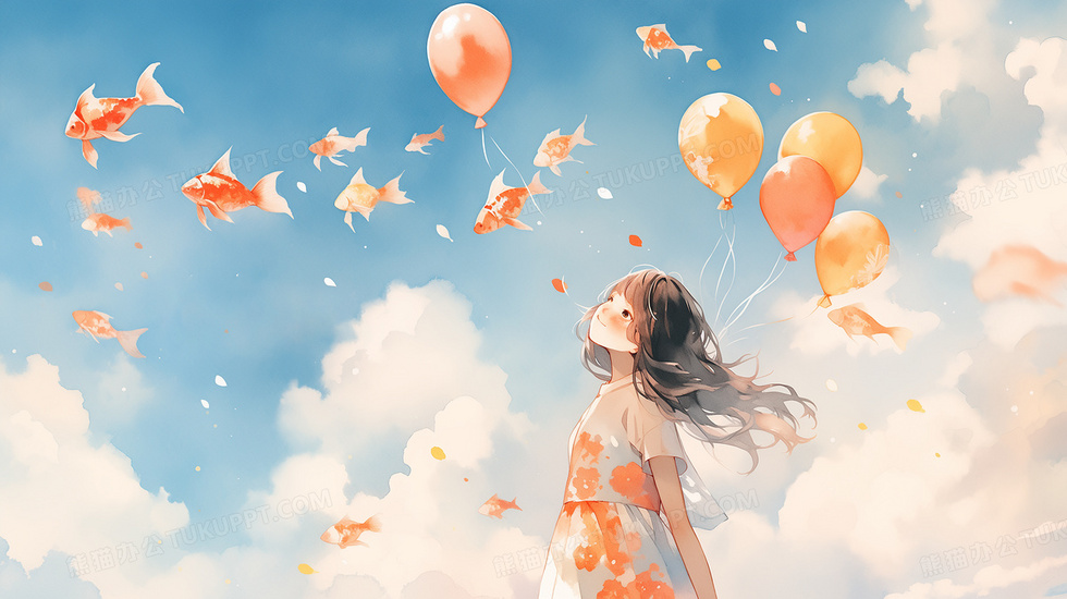 本作品内容为女孩踮起脚尖和空中的金鱼亲吻插画, 格式为 jpg, 大小6 MB, 图片尺寸为2912 x 1632, 源文件无水印, 欢迎使用熊猫办公。 如认为平台内容涉嫌侵权,可通过邮件:tousu@tukuppt.com提出书面通知,我们将及时处理。