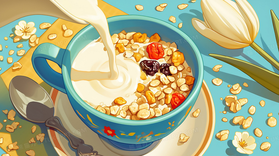 卡通牛奶泡水果坚果早餐零食插画