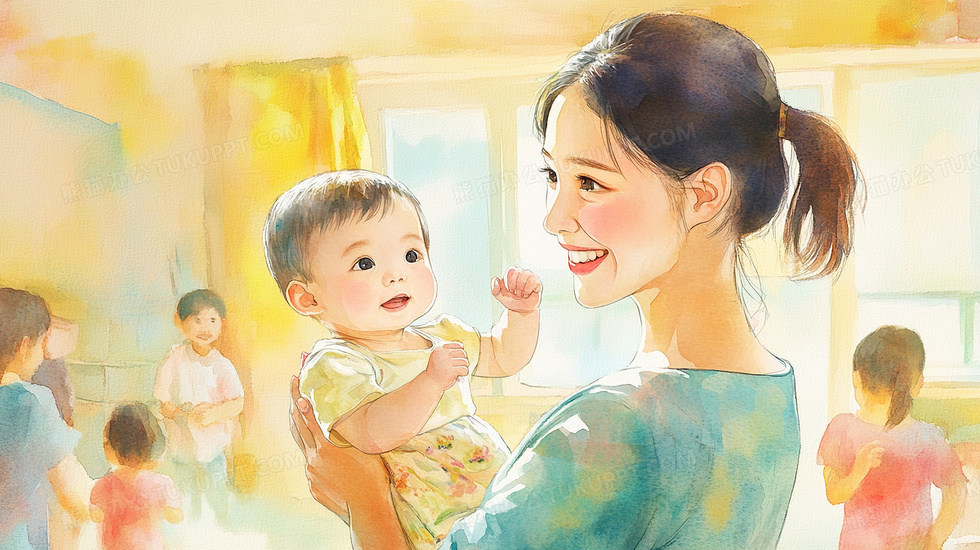 本作品内容为水彩风妈妈在活动室内抱着孩子插画, 格式为 jpg, 大小4 MB, 图片尺寸为2912 x 1632, 源文件无水印, 欢迎使用熊猫办公。 如认为平台内容涉嫌侵权,可通过邮件:tousu@tukuppt.com提出书面通知,我们将及时处理。