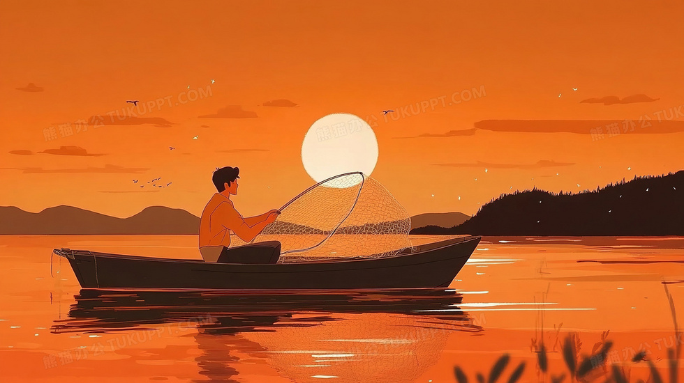 本作品内容为日出日落渔业渔民船只出海捕鱼插画, 格式为 jpg, 大小2 MB, 图片尺寸为2912 x 1632, 源文件无水印, 欢迎使用熊猫办公。 如认为平台内容涉嫌侵权,可通过邮件:tousu@tukuppt.com提出书面通知,我们将及时处理。