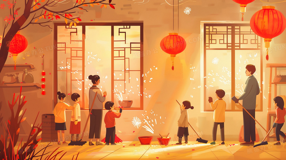 本作品内容为小年打扫卫生放烟花的一家人温馨插画, 格式为 jpg, 大小3 MB, 图片尺寸为2912 x 1632, 源文件无水印, 欢迎使用熊猫办公。 如认为平台内容涉嫌侵权,可通过邮件:tousu@tukuppt.com提出书面通知,我们将及时处理。
