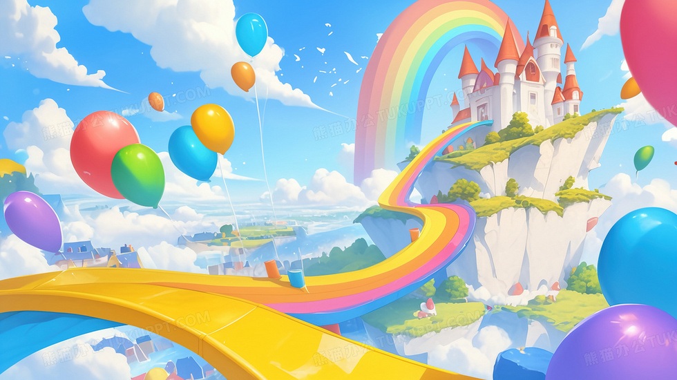 本作品内容为蔚蓝天空彩虹城堡气球插画, 格式为 jpg, 大小2 MB, 图片尺寸为2912 x 1632, 源文件无水印, 欢迎使用熊猫办公。 如认为平台内容涉嫌侵权,可通过邮件:tousu@tukuppt.com提出书面通知,我们将及时处理。