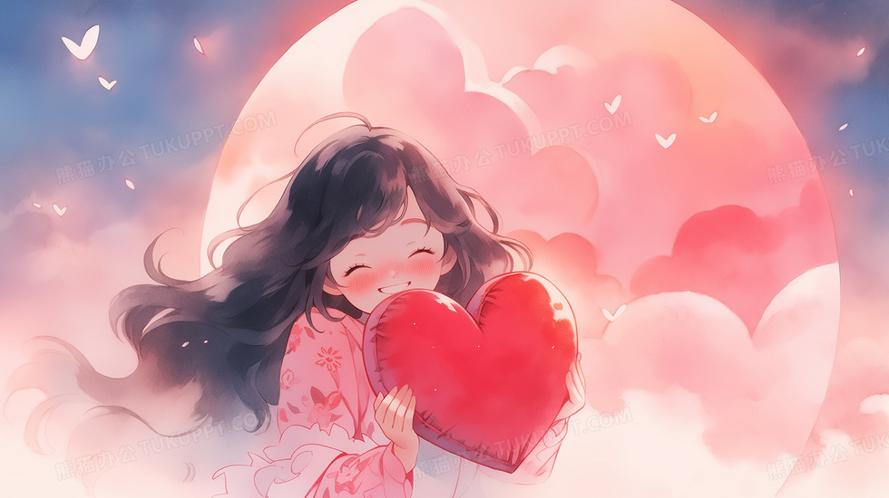 本作品内容为一个女孩抱着一颗爱心唯美插画, 格式为 jpg, 大小7 MB, 图片尺寸为2912 x 1632, 源文件无水印, 欢迎使用熊猫办公。 如认为平台内容涉嫌侵权,可通过邮件:tousu@tukuppt.com提出书面通知,我们将及时处理。
