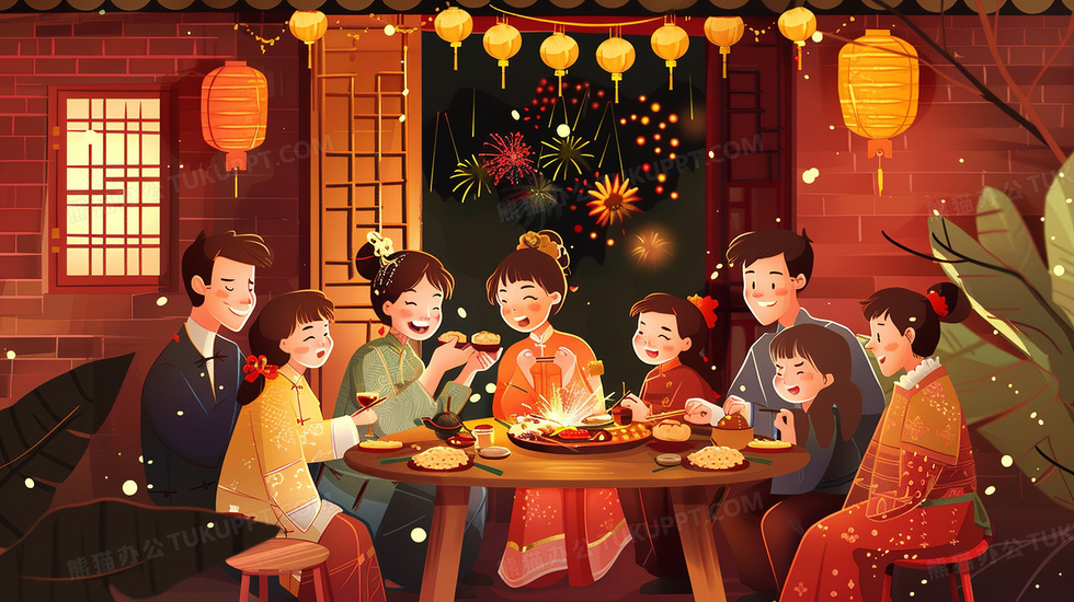 本作品内容为春节一家人在家中团聚吃年夜饭插画, 格式为 jpg, 大小3 MB, 图片尺寸为2912 x 1632, 源文件无水印, 欢迎使用熊猫办公。 如认为平台内容涉嫌侵权,可通过邮件:tousu@tukuppt.com提出书面通知,我们将及时处理。