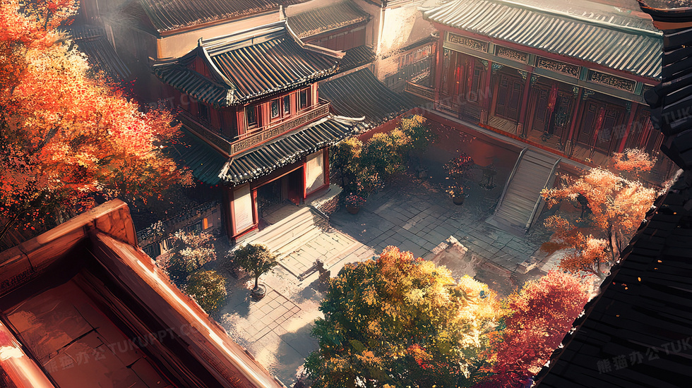 本作品内容为俯视中式建筑庭院风景插画, 格式为 jpg, 大小5 MB, 图片尺寸为2912 x 1632, 源文件无水印, 欢迎使用熊猫办公。 如认为平台内容涉嫌侵权,可通过邮件:tousu@tukuppt.com提出书面通知,我们将及时处理。
