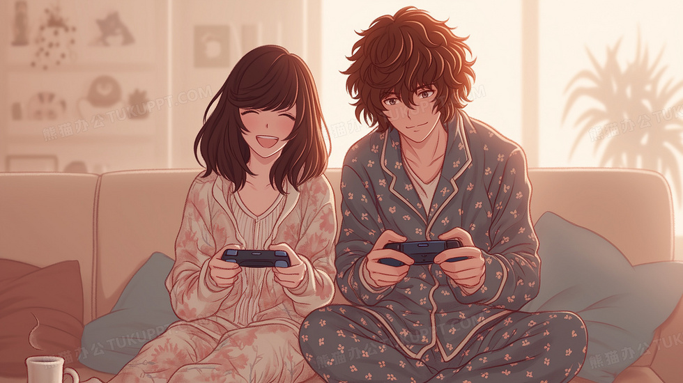 本作品内容为客厅沙发上玩掌上游戏机的情侣插画, 格式为 jpg, 大小3 MB, 图片尺寸为2912 x 1632, 源文件无水印, 欢迎使用熊猫办公。 如认为平台内容涉嫌侵权,可通过邮件:tousu@tukuppt.com提出书面通知,我们将及时处理。