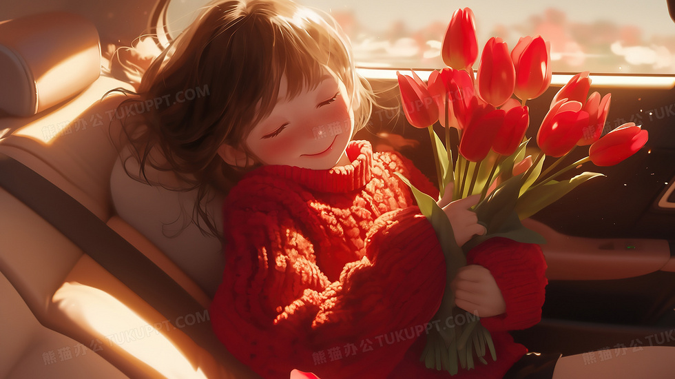 本作品内容为卡通汽车内红色毛衣女人捧着郁金香插画, 格式为 jpg, 大小3 MB, 图片尺寸为2912 x 1632, 源文件无水印, 欢迎使用熊猫办公。 如认为平台内容涉嫌侵权,可通过邮件:tousu@tukuppt.com提出书面通知,我们将及时处理。