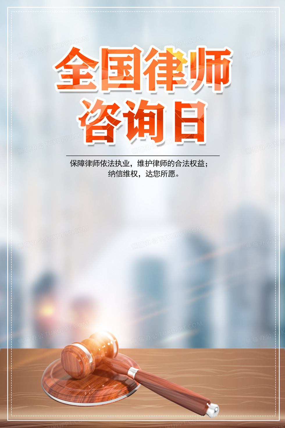 本作品内容为全国律师咨询日法律咨询法槌背景, 格式为 psd, 大小64 MB, 图片尺寸为3543 x 5315, 作品中背景图片无需修改, 源文件无水印,可以直接使用, 欢迎使用熊猫办公。 如认为平台内容涉嫌侵权,可通过邮件:tousu@tukuppt.com提出书面通知,我们将及时处理。