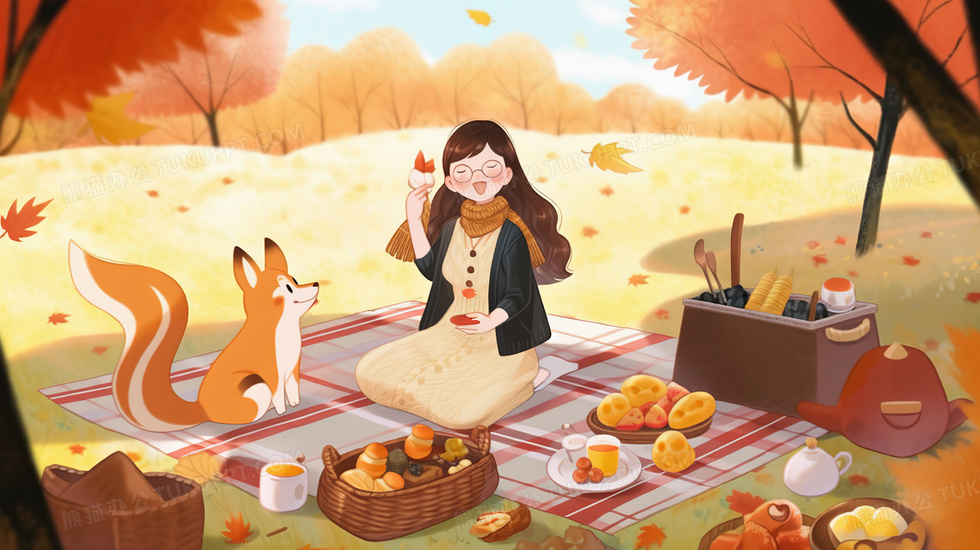 首页 > 插画 > 科技艺术 > 水彩手绘 > 秋天女孩在公园金色的枫树下和小动物一起野餐