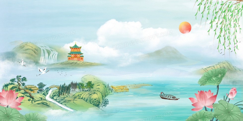 本作品内容为中国风传统小暑节气意境中国风莲花山水背景, 格式为 psd, 大小45 MB, 图片尺寸为4724 x 2362, 作品中背景图片无需修改, 源文件无水印,可以直接使用, 欢迎使用熊猫办公。 如认为平台内容涉嫌侵权,可通过邮件:tousu@tukuppt.com提出书面通知,我们将及时处理。