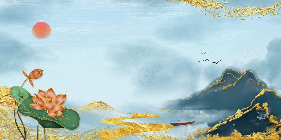 本作品内容为新中式荷花鎏金山水意境雅致中国风背景, 格式为 psd, 大小93 MB, 图片尺寸为4724 x 2362, 作品中背景图片无需修改, 源文件无水印,可以直接使用, 欢迎使用熊猫办公。 如认为平台内容涉嫌侵权,可通过邮件:tousu@tukuppt.com提出书面通知,我们将及时处理。