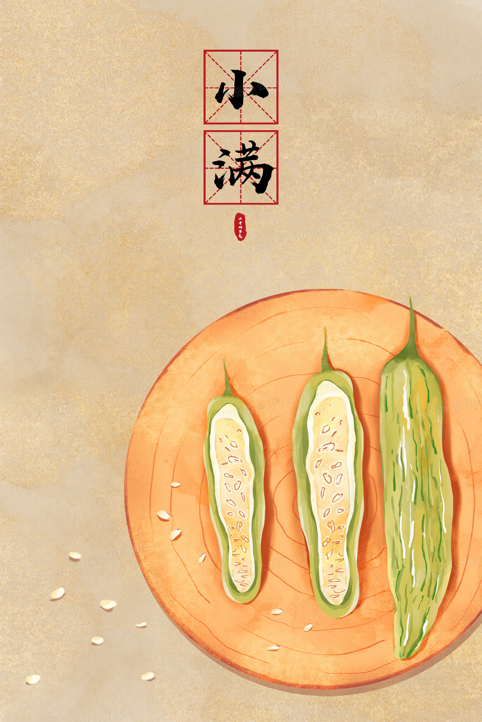 本作品内容为二十四节气手绘食物插画之小满吃苦瓜, 格式为 psd, 大小113 MB, 图片尺寸为2343 x 3508, 作品中背景图片无需修改, 源文件无水印,可以直接使用, 欢迎使用熊猫办公。 如认为平台内容涉嫌侵权,可通过邮件:tousu@tukuppt.com提出书面通知,我们将及时处理。