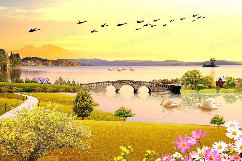 本作品内容为大雁天鹅湖边美景晚霞图, 格式为 psd, 图片尺寸为5315 x 3543, 作品中背景图片无需修改, 源文件无水印,可以直接使用, 欢迎使用熊猫办公。 如认为平台内容涉嫌侵权,可通过邮件:tousu@tukuppt.com提出书面通知,我们将及时处理。