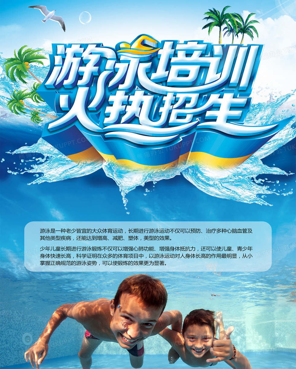 本作品内容为游泳培训班两面宣传背景素材, 格式为 psd, 图片尺寸为3551 x 4437, 作品中背景图片无需修改, 源文件无水印,可以直接使用, 欢迎使用熊猫办公。 如认为平台内容涉嫌侵权,可通过邮件:tousu@tukuppt.com提出书面通知,我们将及时处理。