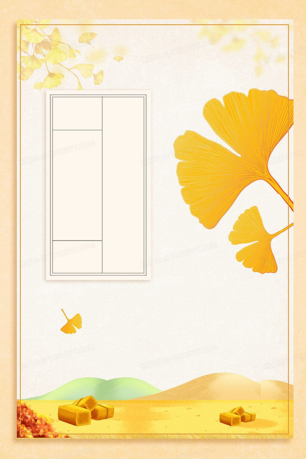 本作品内容为金秋时节银杏叶飘落背景, 格式为 psd, 大小106 MB, 图片尺寸为3543 x 5315, 作品中背景图片无需修改, 源文件无水印,可以直接使用, 欢迎使用熊猫办公。 如认为平台内容涉嫌侵权,可通过邮件:tousu@tukuppt.com提出书面通知,我们将及时处理。
