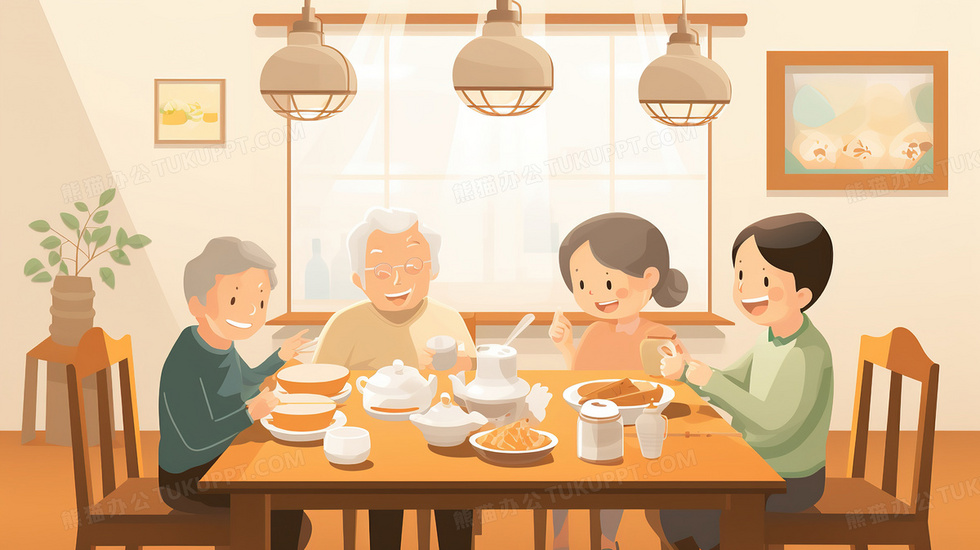 本作品内容为在家陪伴老人吃饭温馨插画, 格式为 jpg, 大小4 MB, 图片尺寸为2912 x 1632, 源文件无水印, 欢迎使用熊猫办公。 如认为平台内容涉嫌侵权,可通过邮件:tousu@tukuppt.com提出书面通知,我们将及时处理。