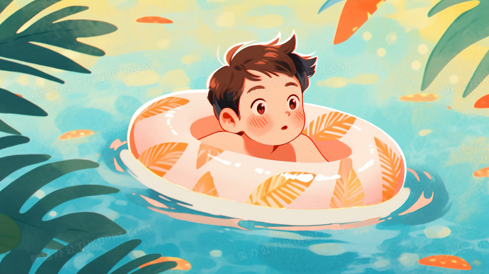 本作品内容为夏日海边带着救生圈游泳的男孩插画, 格式为 jpg, 大小2 MB, 图片尺寸为2912 x 1632, 源文件无水印, 欢迎使用熊猫办公。 如认为平台内容涉嫌侵权,可通过邮件:tousu@tukuppt.com提出书面通知,我们将及时处理。