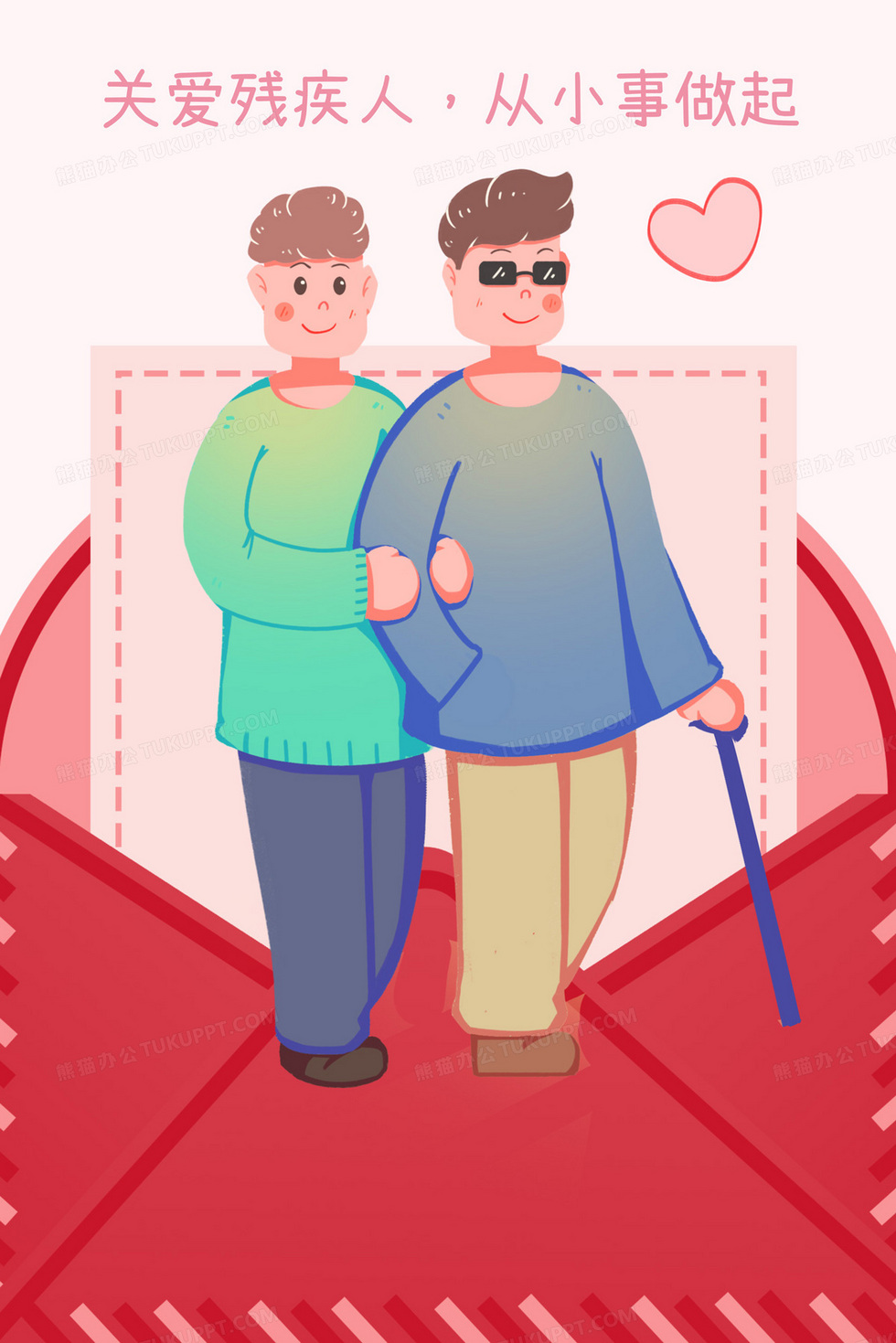 本作品内容为关爱残疾人爱心公益宣传插画, 格式为 psd, 大小17 MB, 请使用软件PhotoShop(CC)打开, 源文件无水印, 欢迎使用熊猫办公。 如认为平台内容涉嫌侵权,可通过邮件:tousu@tukuppt.com提出书面通知,我们将及时处理。