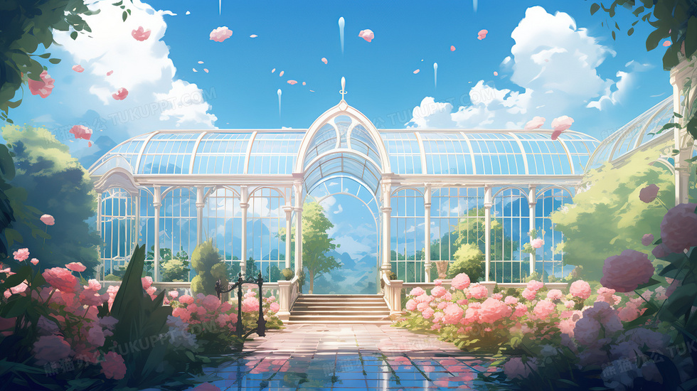 首页 > 插画 > 科技艺术 > 唯美清新 > 蓝天白云唯美梦幻玻璃花房下的粉色玫瑰花创意插画