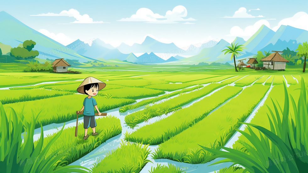 本作品内容为春季山边翠绿辽阔的水稻田插画, 格式为 jpg, 大小5 MB, 图片尺寸为2912 x 1632, 源文件无水印, 欢迎使用熊猫办公。 如认为平台内容涉嫌侵权,可通过邮件:tousu@tukuppt.com提出书面通知,我们将及时处理。