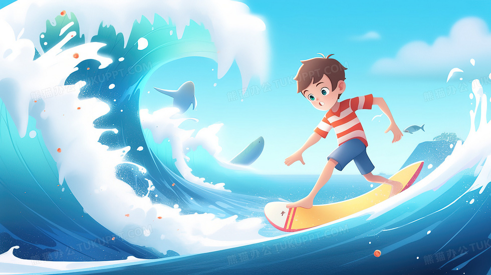 本作品内容为可爱卡通男孩在海面上玩冲浪创意插画, 格式为 jpg, 大小5 MB, 图片尺寸为2912 x 1632, 源文件无水印, 欢迎使用熊猫办公。 如认为平台内容涉嫌侵权,可通过邮件:tousu@tukuppt.com提出书面通知,我们将及时处理。