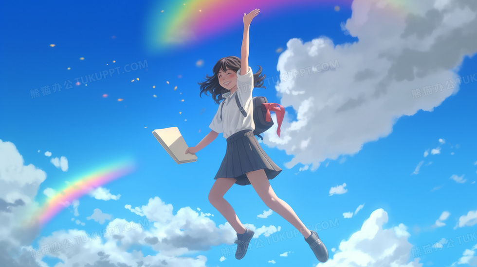 本作品内容为女孩拿到录取通知书开心的跳跃在空中创意插画, 格式为 jpg, 大小2 MB, 图片尺寸为2912 x 1632, 源文件无水印, 欢迎使用熊猫办公。 如认为平台内容涉嫌侵权,可通过邮件:tousu@tukuppt.com提出书面通知,我们将及时处理。