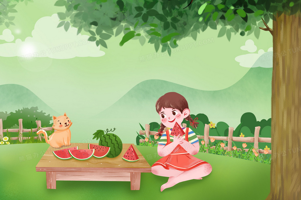 本作品内容为炎热夏季树下解暑吃西瓜插画, 格式为 psd, 大小77 MB, 请使用软件PhotoShop(CC)打开, 源文件无水印, 欢迎使用熊猫办公。 如认为平台内容涉嫌侵权,可通过邮件:tousu@tukuppt.com提出书面通知,我们将及时处理。