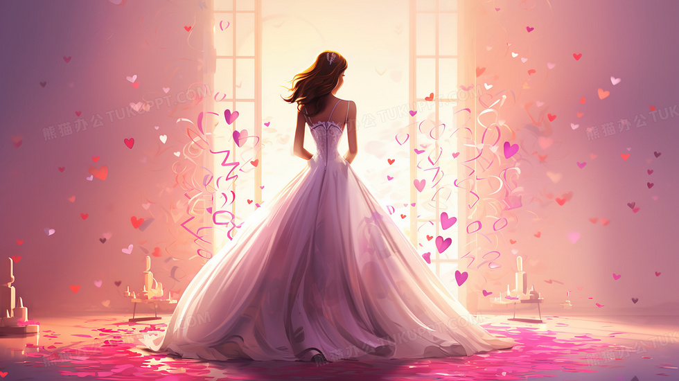 本作品内容为粉色情人节穿婚纱的女孩爱心插画, 格式为 jpg, 大小4 MB, 图片尺寸为2912 x 1632, 源文件无水印, 欢迎使用熊猫办公。 如认为平台内容涉嫌侵权,可通过邮件:tousu@tukuppt.com提出书面通知,我们将及时处理。