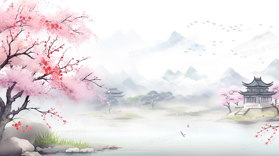 本作品内容为中国风湖边粉色花朵山水风景插画, 格式为 jpg, 大小5 MB, 图片尺寸为2912 x 1632, 源文件无水印, 欢迎使用熊猫办公。 如认为平台内容涉嫌侵权,可通过邮件:tousu@tukuppt.com提出书面通知,我们将及时处理。