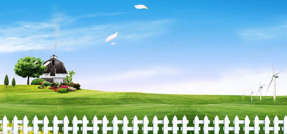 本作品内容为蓝天白云绿色草地木屋围栏风力发电海报banner, 格式为 psd, 图片尺寸为1920 x 900, 作品中背景图片无需修改, 源文件无水印,可以直接使用, 欢迎使用熊猫办公。 如认为平台内容涉嫌侵权,可通过邮件:tousu@tukuppt.com提出书面通知,我们将及时处理。