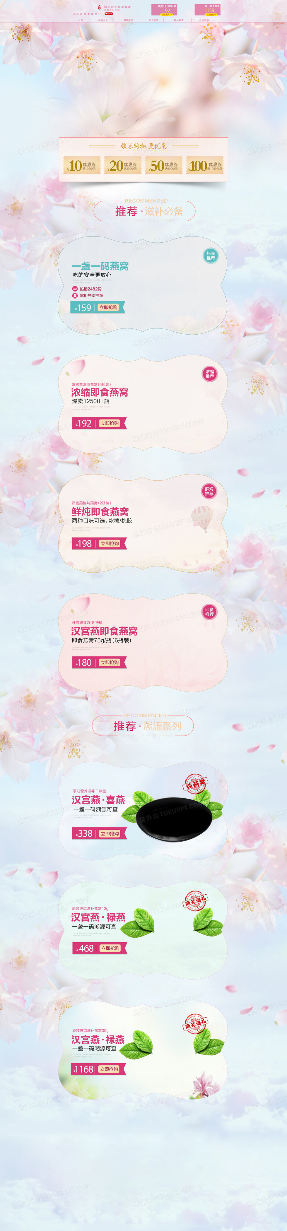 本作品内容为粉色花卉养生食品店铺首页背景, 格式为 psd, 图片尺寸为1920 x 8239, 作品中背景图片无需修改, 源文件无水印,可以直接使用, 欢迎使用熊猫办公。 如认为平台内容涉嫌侵权,可通过邮件:tousu@tukuppt.com提出书面通知,我们将及时处理。