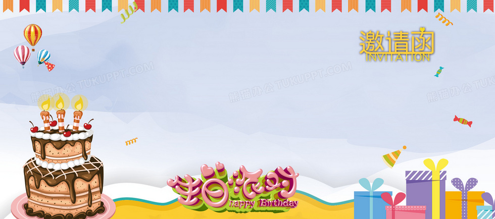 本作品内容为生日邀请函狂欢海报banner背景, 格式为 psd, 图片尺寸为1920 x 849, 作品中背景图片无需修改, 源文件无水印,可以直接使用, 欢迎使用熊猫办公。 如认为平台内容涉嫌侵权,可通过邮件:tousu@tukuppt.com提出书面通知,我们将及时处理。