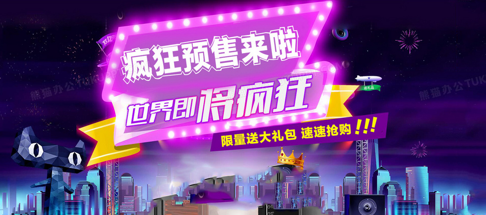本作品内容为疯狂预售海报, 格式为 psd, 图片尺寸为1920 x 850, 作品中背景图片无需修改, 源文件无水印,可以直接使用, 欢迎使用熊猫办公。 如认为平台内容涉嫌侵权,可通过邮件:tousu@tukuppt.com提出书面通知,我们将及时处理。