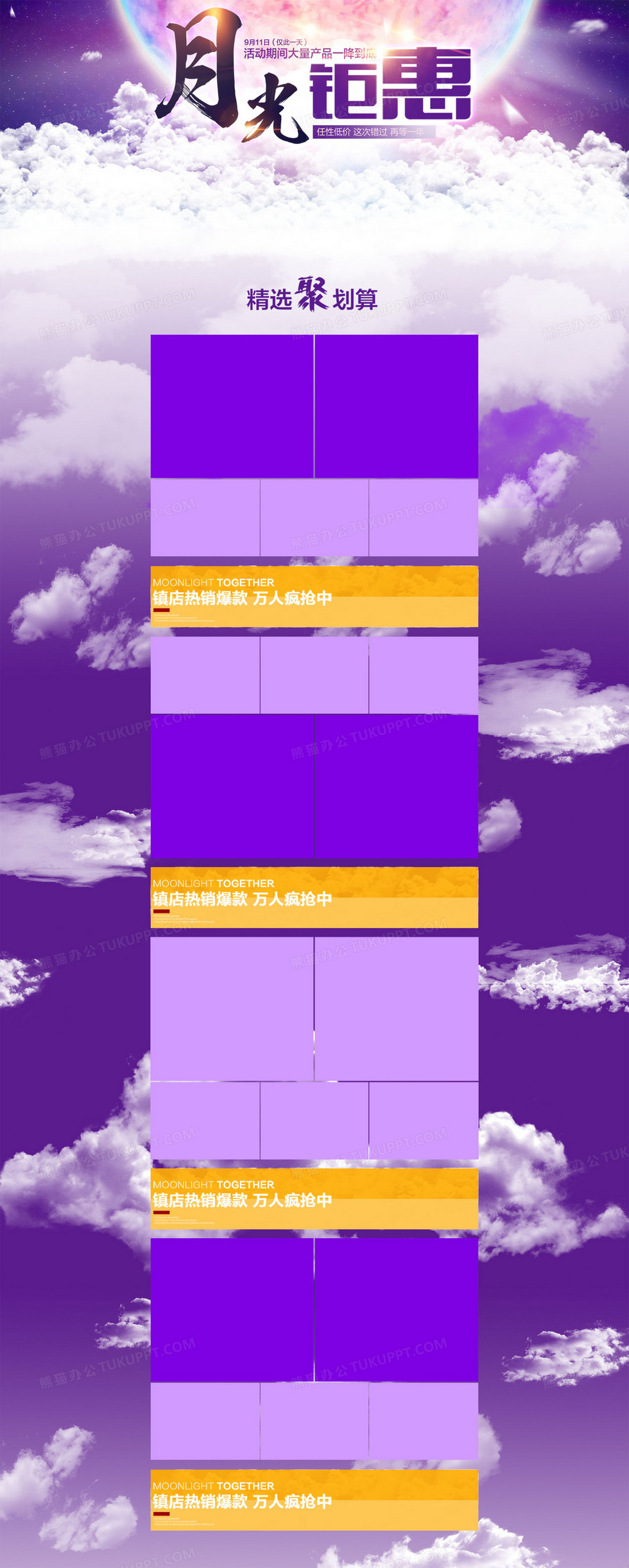 本作品内容为月光钜惠店铺背景, 格式为 psd, 图片尺寸为1920 x 4783, 作品中背景图片无需修改, 源文件无水印,可以直接使用, 欢迎使用熊猫办公。 如认为平台内容涉嫌侵权,可通过邮件:tousu@tukuppt.com提出书面通知,我们将及时处理。