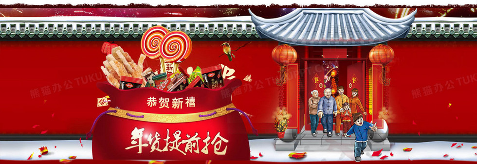 本作品内容为淘宝年货节促销中国风海报, 格式为 psd, 图片尺寸为1920 x 660, 作品中背景图片无需修改, 源文件无水印,可以直接使用, 欢迎使用熊猫办公。 如认为平台内容涉嫌侵权,可通过邮件:tousu@tukuppt.com提出书面通知,我们将及时处理。