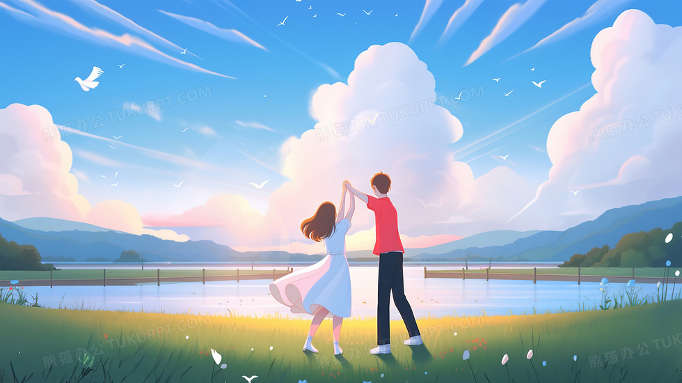 本作品内容为可爱小情侣湖边草地上跳舞插画, 格式为 jpg, 大小3 MB, 图片尺寸为2912 x 1632, 源文件无水印, 欢迎使用熊猫办公。 如认为平台内容涉嫌侵权,可通过邮件:tousu@tukuppt.com提出书面通知,我们将及时处理。