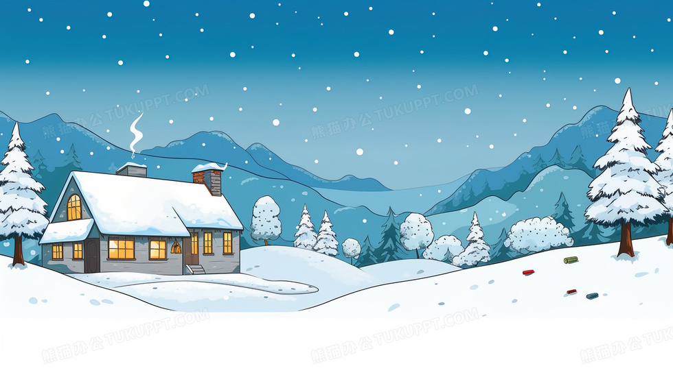 本作品内容为冬天雪中山林里的小木屋插画, 格式为 jpg, 大小5 MB, 图片尺寸为2912 x 1632, 源文件无水印, 欢迎使用熊猫办公。 如认为平台内容涉嫌侵权,可通过邮件:tousu@tukuppt.com提出书面通知,我们将及时处理。