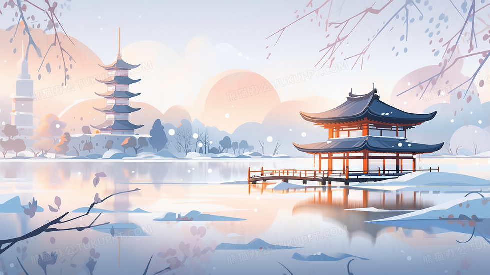 本作品内容为初冬山边湖中的中式阁楼插画, 格式为 jpg, 大小5 MB, 图片尺寸为2912 x 1632, 源文件无水印, 欢迎使用熊猫办公。 如认为平台内容涉嫌侵权,可通过邮件:tousu@tukuppt.com提出书面通知,我们将及时处理。