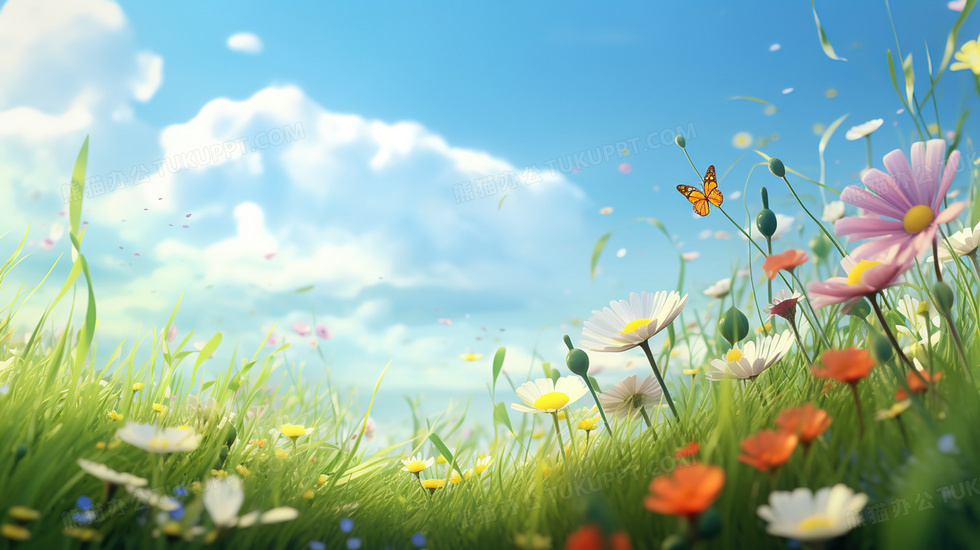 本作品内容为春天绿色草地上绽放的花海唯美清新插画, 格式为 jpg, 大小5 MB, 图片尺寸为2912 x 1632, 源文件无水印, 欢迎使用熊猫办公。 如认为平台内容涉嫌侵权,可通过邮件:tousu@tukuppt.com提出书面通知,我们将及时处理。