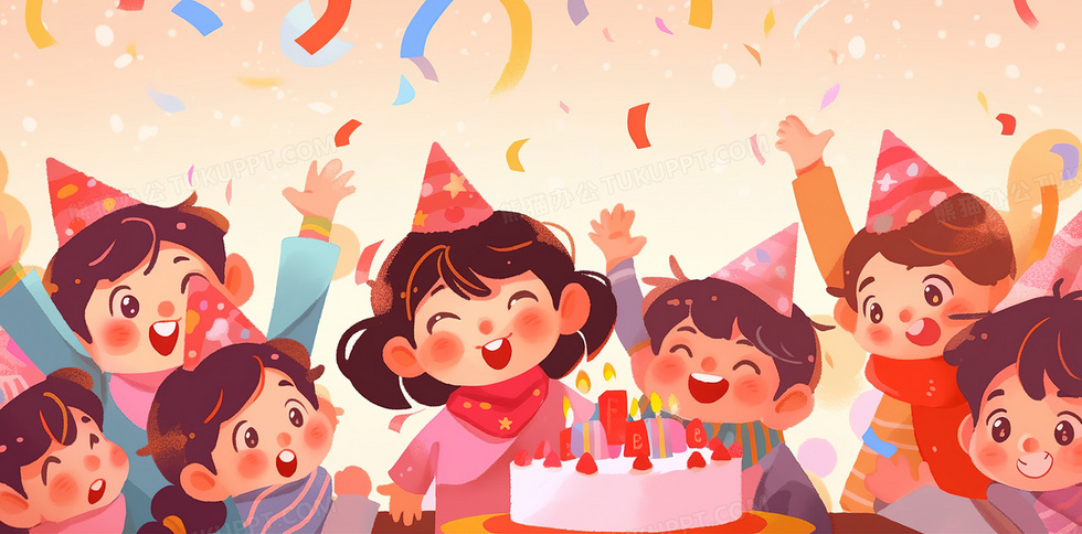 本作品内容为卡通可爱小朋友庆祝生日派对创意插画, 格式为 jpg, 大小4 MB, 图片尺寸为2900 x 1434, 源文件无水印, 欢迎使用熊猫办公。 如认为平台内容涉嫌侵权,可通过邮件:tousu@tukuppt.com提出书面通知,我们将及时处理。
