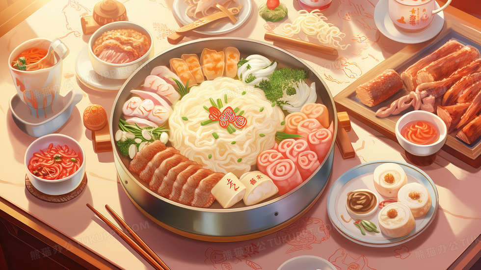 本作品内容为丰盛的春节火锅美食插画, 格式为 jpg, 大小6 MB, 图片尺寸为2912 x 1632, 源文件无水印, 欢迎使用熊猫办公。 如认为平台内容涉嫌侵权,可通过邮件:tousu@tukuppt.com提出书面通知,我们将及时处理。