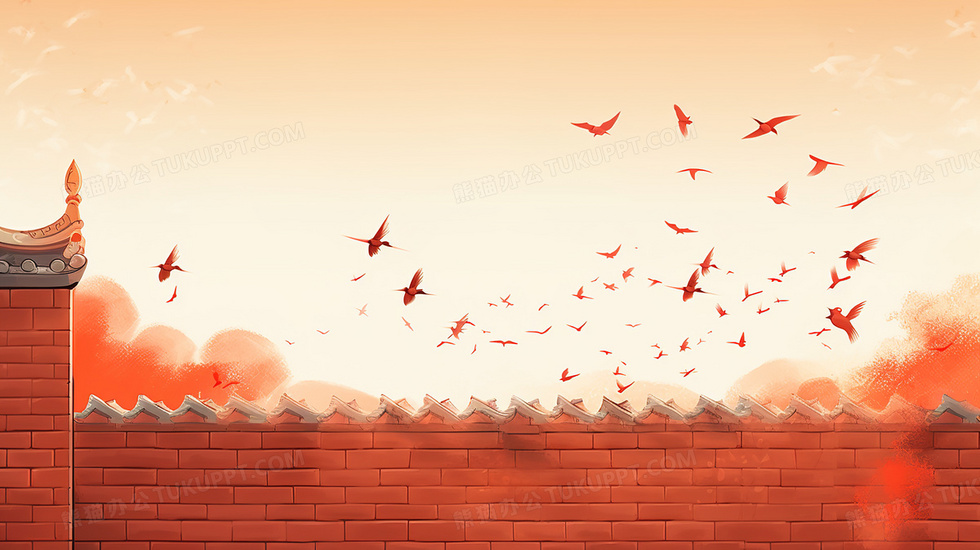 本作品内容为中国风古典建筑院墙外成群的飞鸟插画, 格式为 jpg, 大小4 MB, 图片尺寸为2912 x 1632, 源文件无水印, 欢迎使用熊猫办公。 如认为平台内容涉嫌侵权,可通过邮件:tousu@tukuppt.com提出书面通知,我们将及时处理。