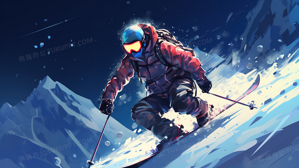 本作品内容为雪山上独自滑雪的人激情运动插画, 格式为 jpg, 大小5 MB, 图片尺寸为2912 x 1632, 源文件无水印, 欢迎使用熊猫办公。 如认为平台内容涉嫌侵权,可通过邮件:tousu@tukuppt.com提出书面通知,我们将及时处理。