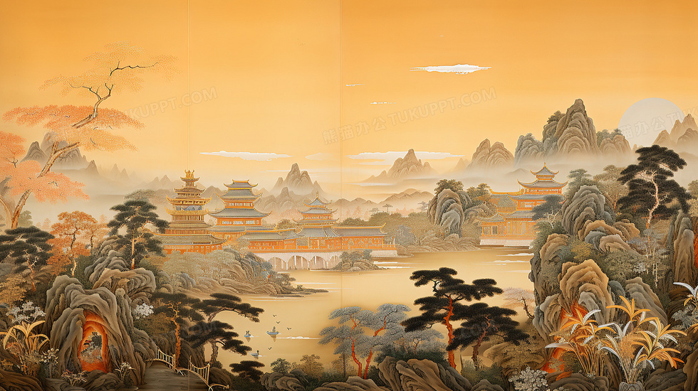 本作品内容为唯美中国风古代建筑山水风景插画, 格式为 jpg, 大小9 MB, 图片尺寸为2912 x 1632, 源文件无水印, 欢迎使用熊猫办公。 如认为平台内容涉嫌侵权,可通过邮件:tousu@tukuppt.com提出书面通知,我们将及时处理。