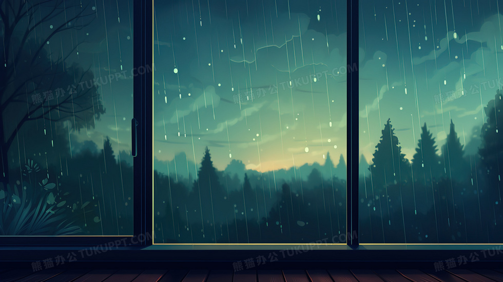 本作品内容为窗外森林傍晚的雨景插画, 格式为 jpg, 大小4 MB, 图片尺寸为2912 x 1632, 源文件无水印, 欢迎使用熊猫办公。 如认为平台内容涉嫌侵权,可通过邮件:tousu@tukuppt.com提出书面通知,我们将及时处理。